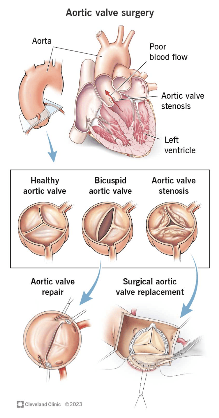 - Протезиране на аортна клапа: Увредената клапа се заменя с изкуствена (механична или биологична).